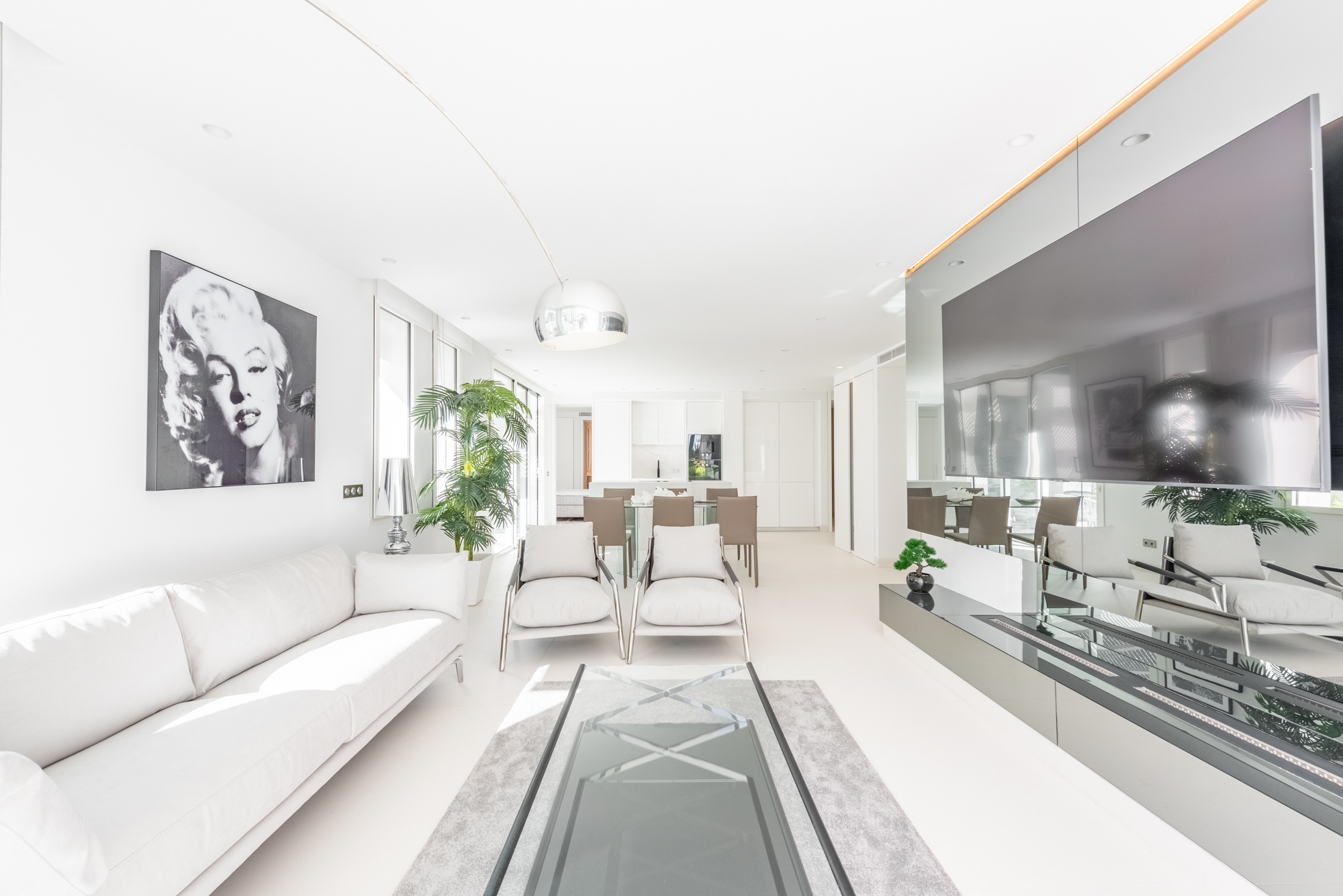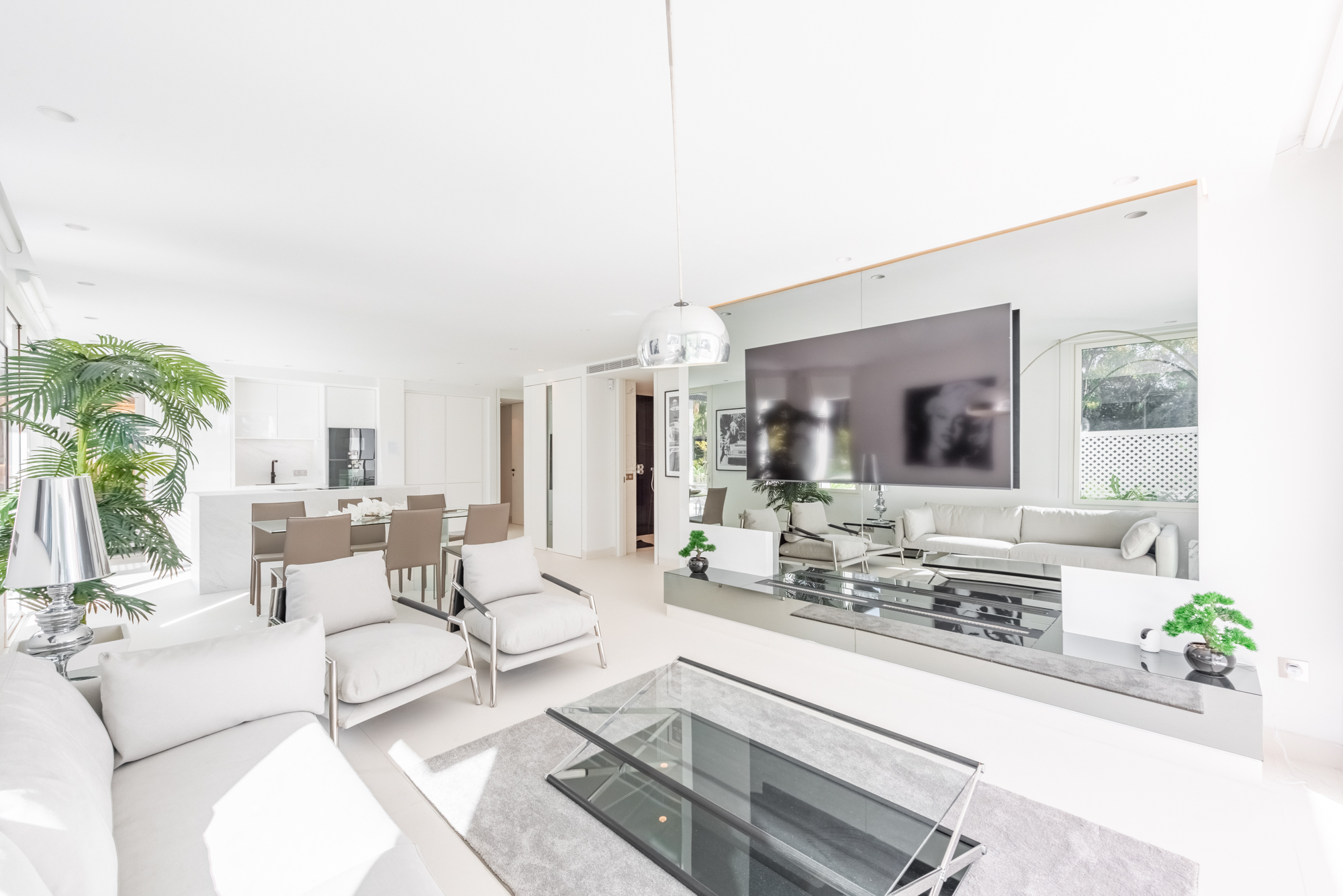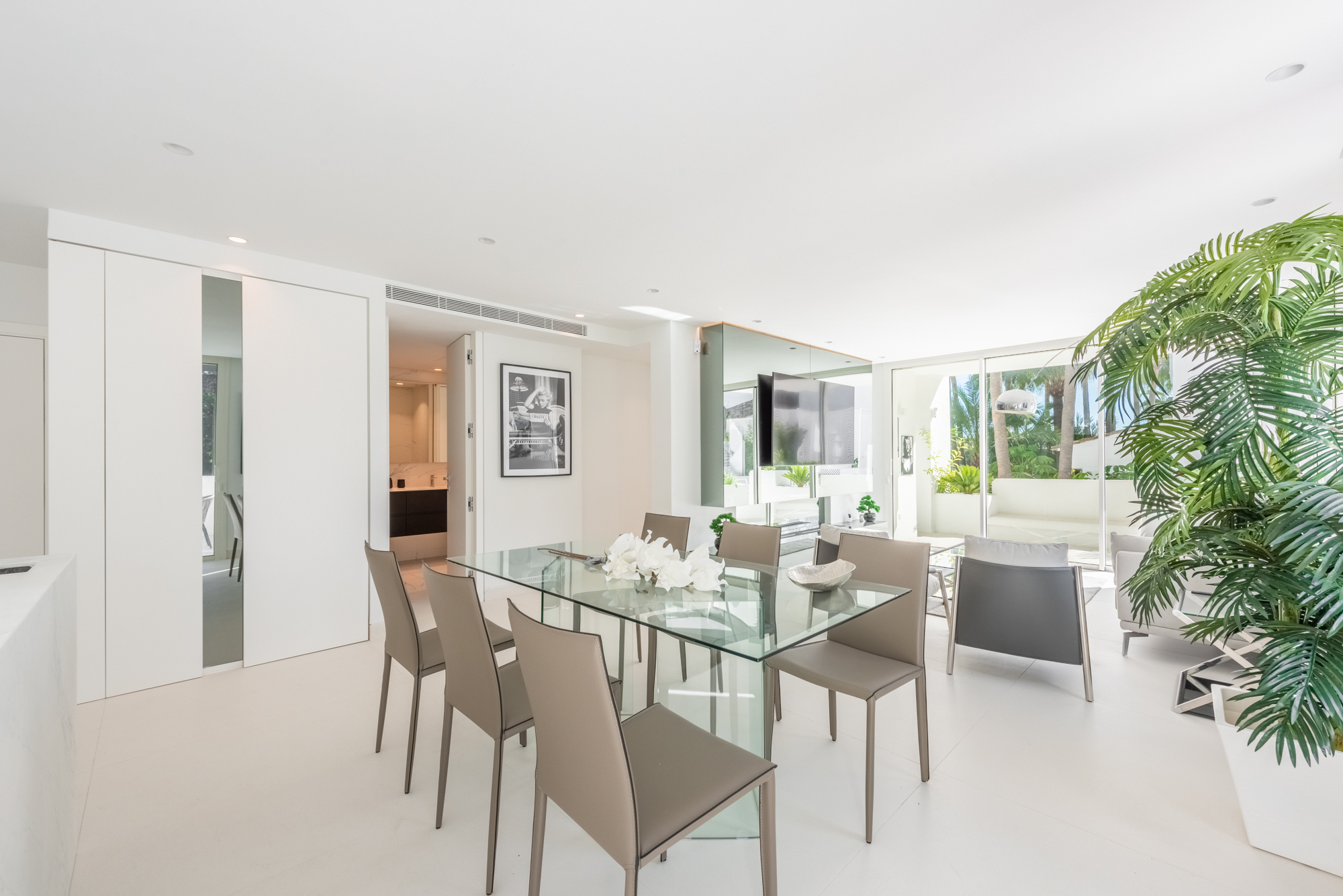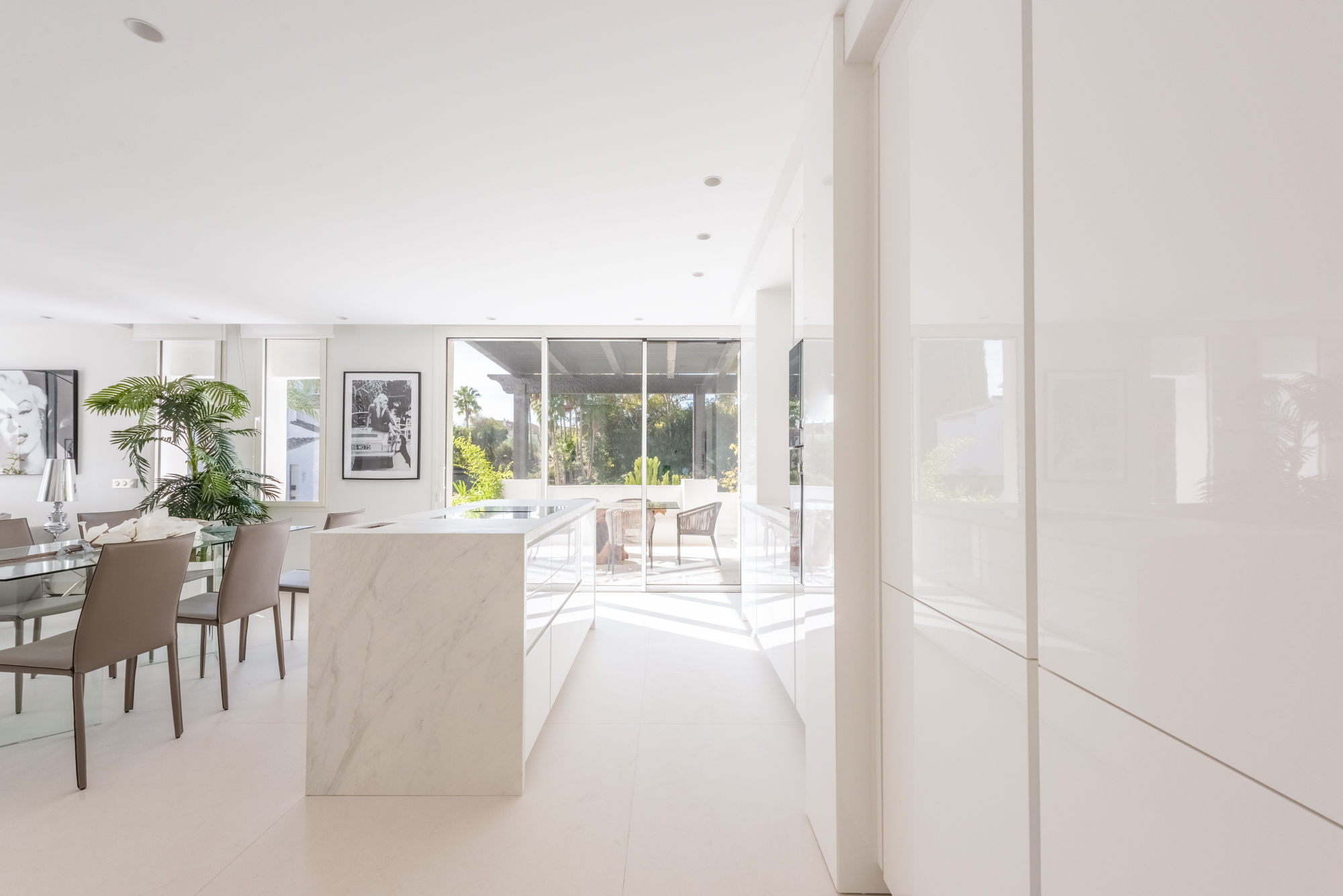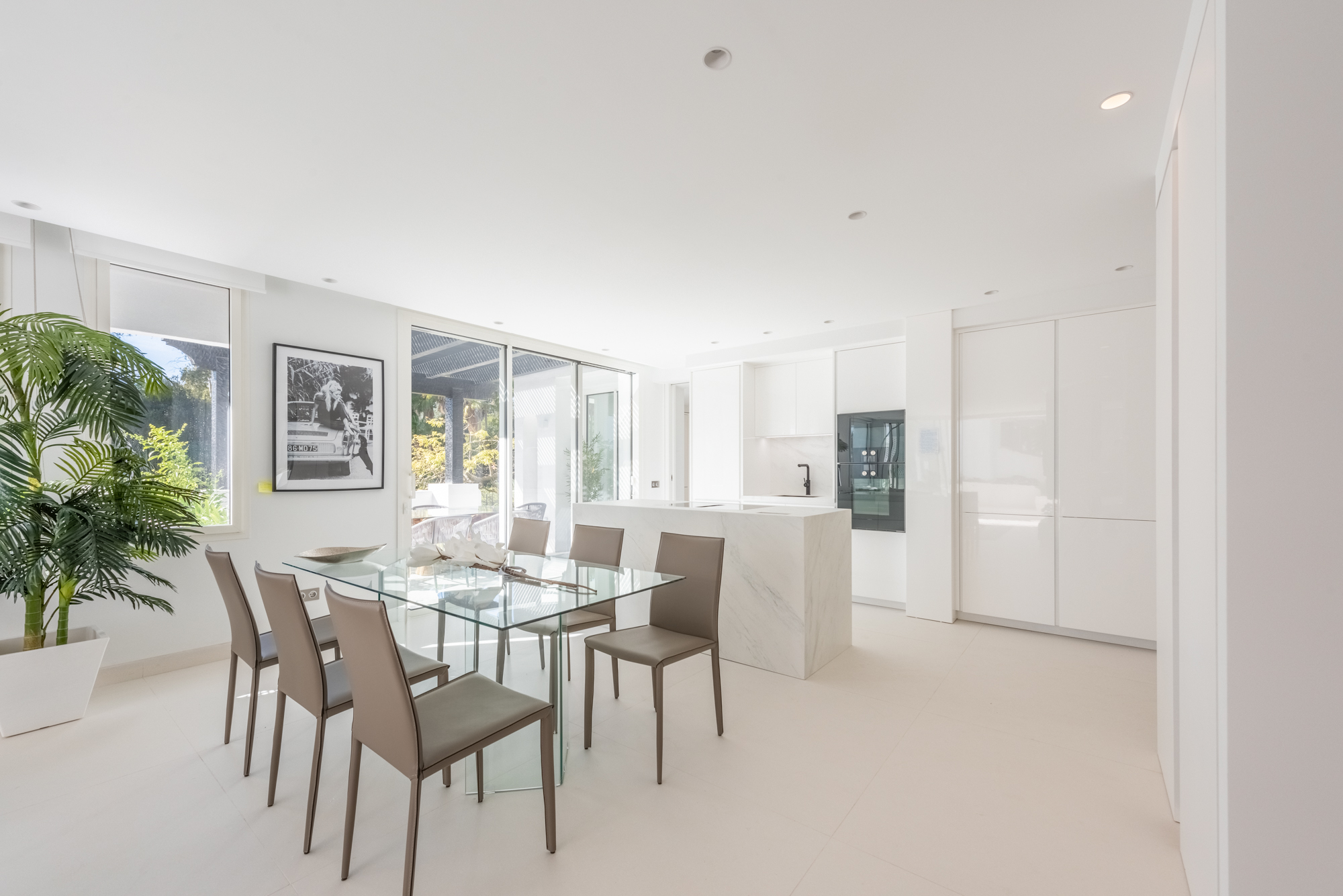 El salón–comedor se organiza en planta abierta, con chimenea y una cocina de diseño integrada, equipada con electrodomésticos de gama alta Gaggenau. El conjunto transmite una sensación de espacio fluido, elegante y funcional, pensado tanto para uso vacacional como para vivir largas estancias en Marbella.