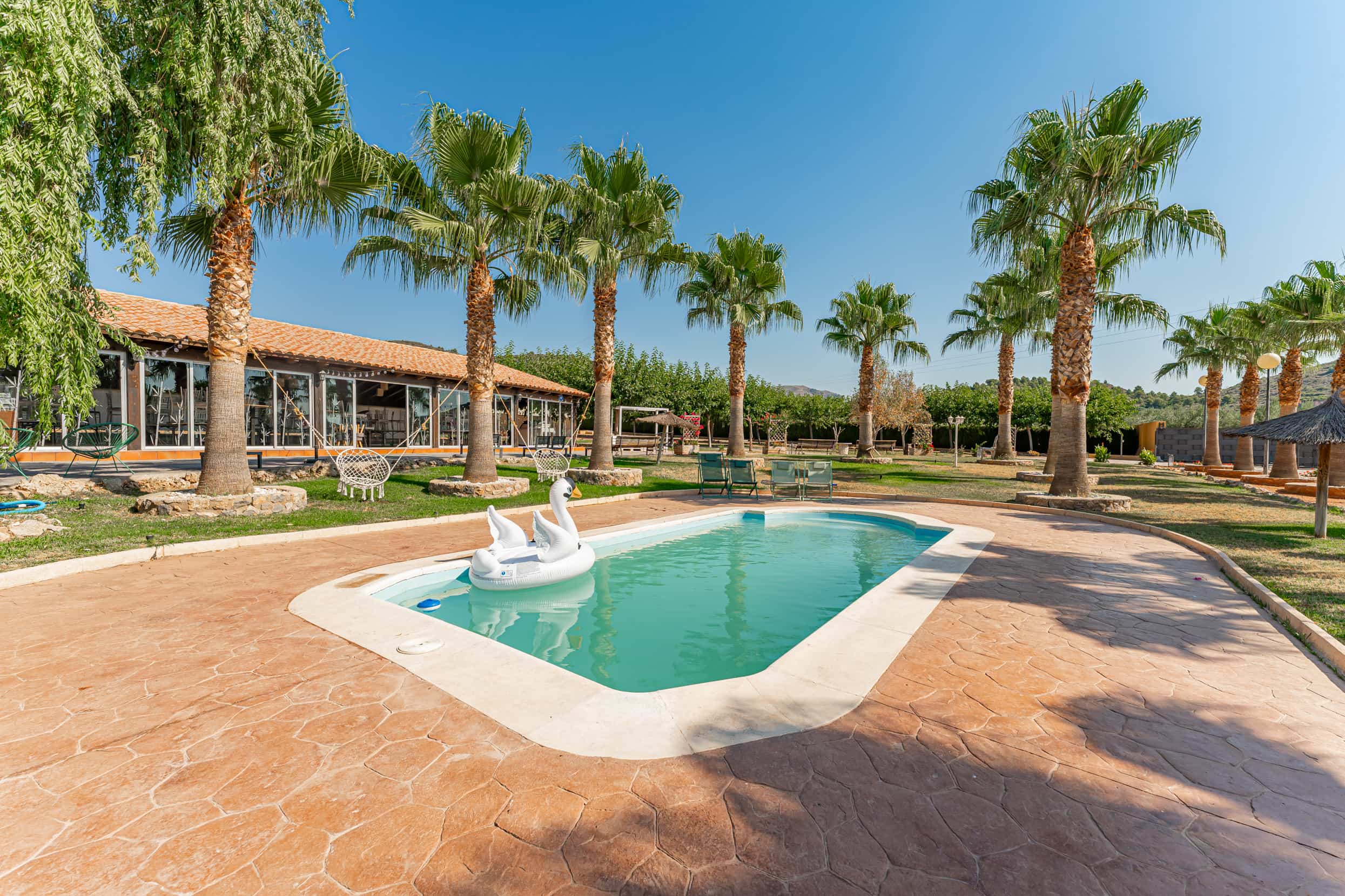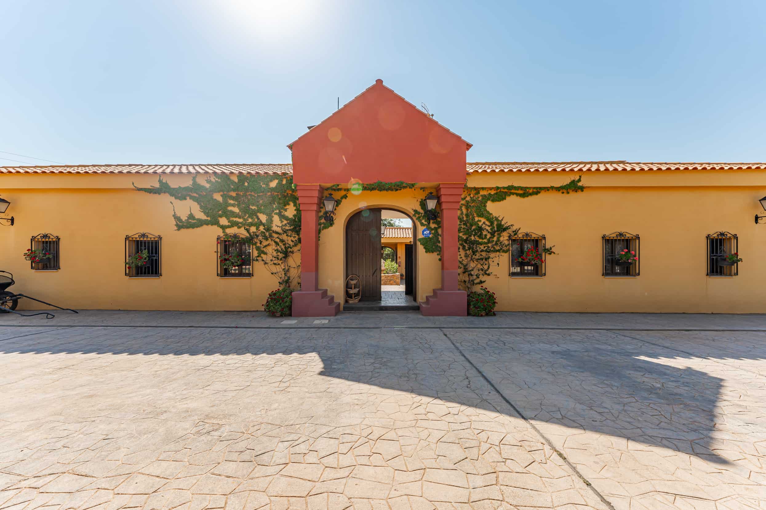 Frente al cortijo encontramos una gran piscina con zona chill out, y zona de bienvenida de invitados, así como un amplio aparcamiento. En esta zona superior del complejo se sitúa un edificio habilitado como salón de banquetes con capacidad para 180 comensales y que cuenta con todos los servicios necesarios como cocina profesional, paellero y aseos. Cuenta además con una amplia zona ajardinada para ubicar zona de juegos para niños.