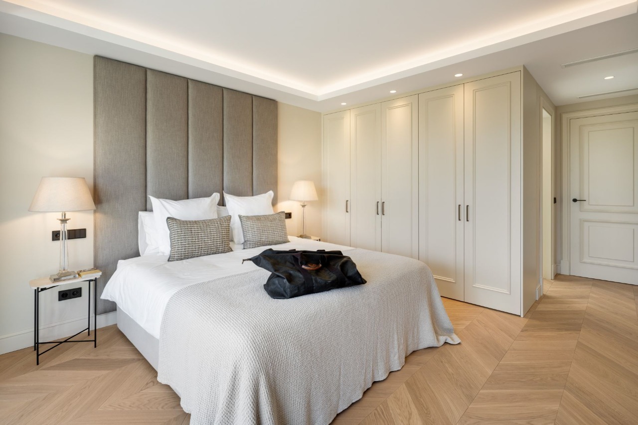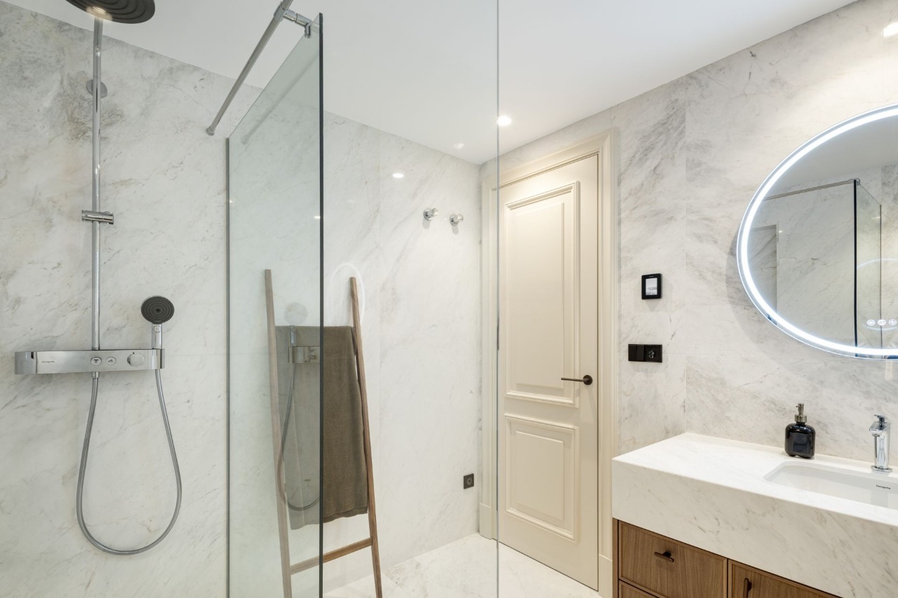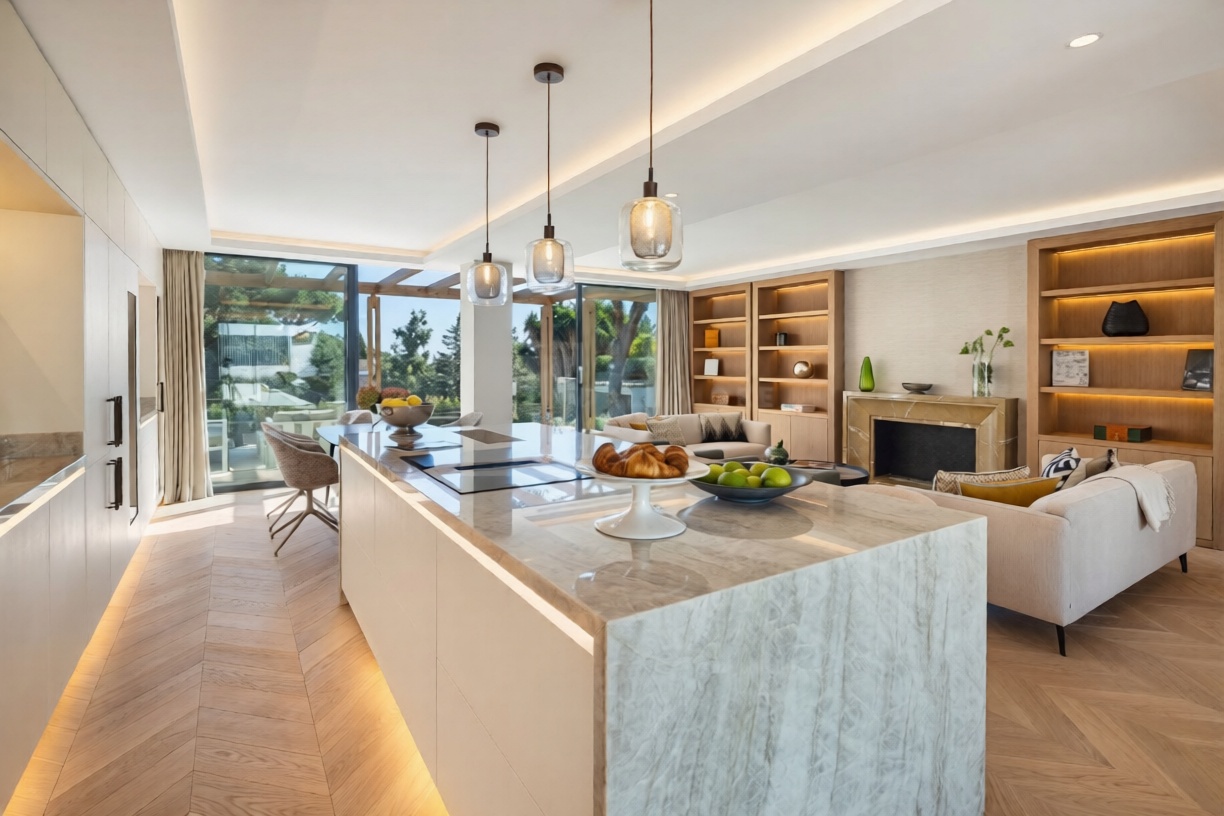 • Materiales de alta gama: encimeras Taj Mahal, baños en mármol blanco Areti y suelos de madera en espiga Atelier.