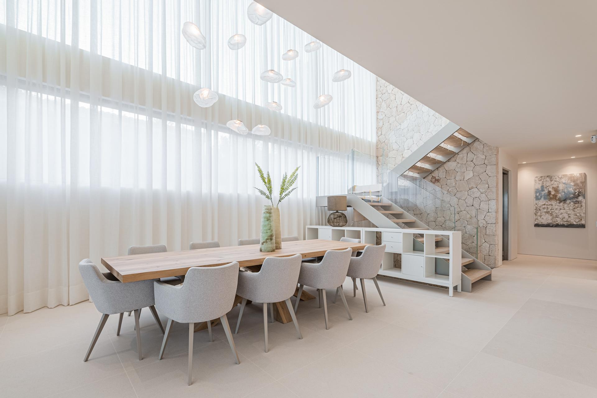 Esta vivienda en Mallorca consta de numerosas terrazas que incluyen áreas de comedor al aire libre, además de sala de cine, spa con jacuzzi y sauna, gimnasio, sala de juegos con mesa de billar y tenis de mesa, bodega, jardín y piscina infinity climatizada. Además, cuenta con un garaje con capacidad para hasta 4 vehículos.