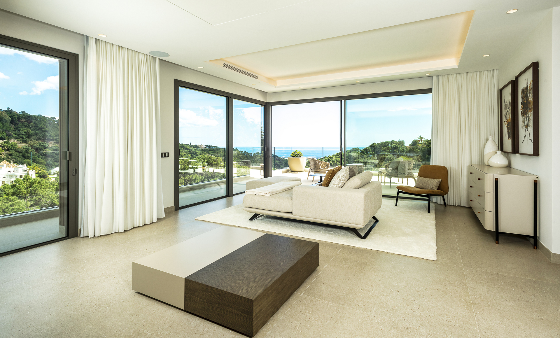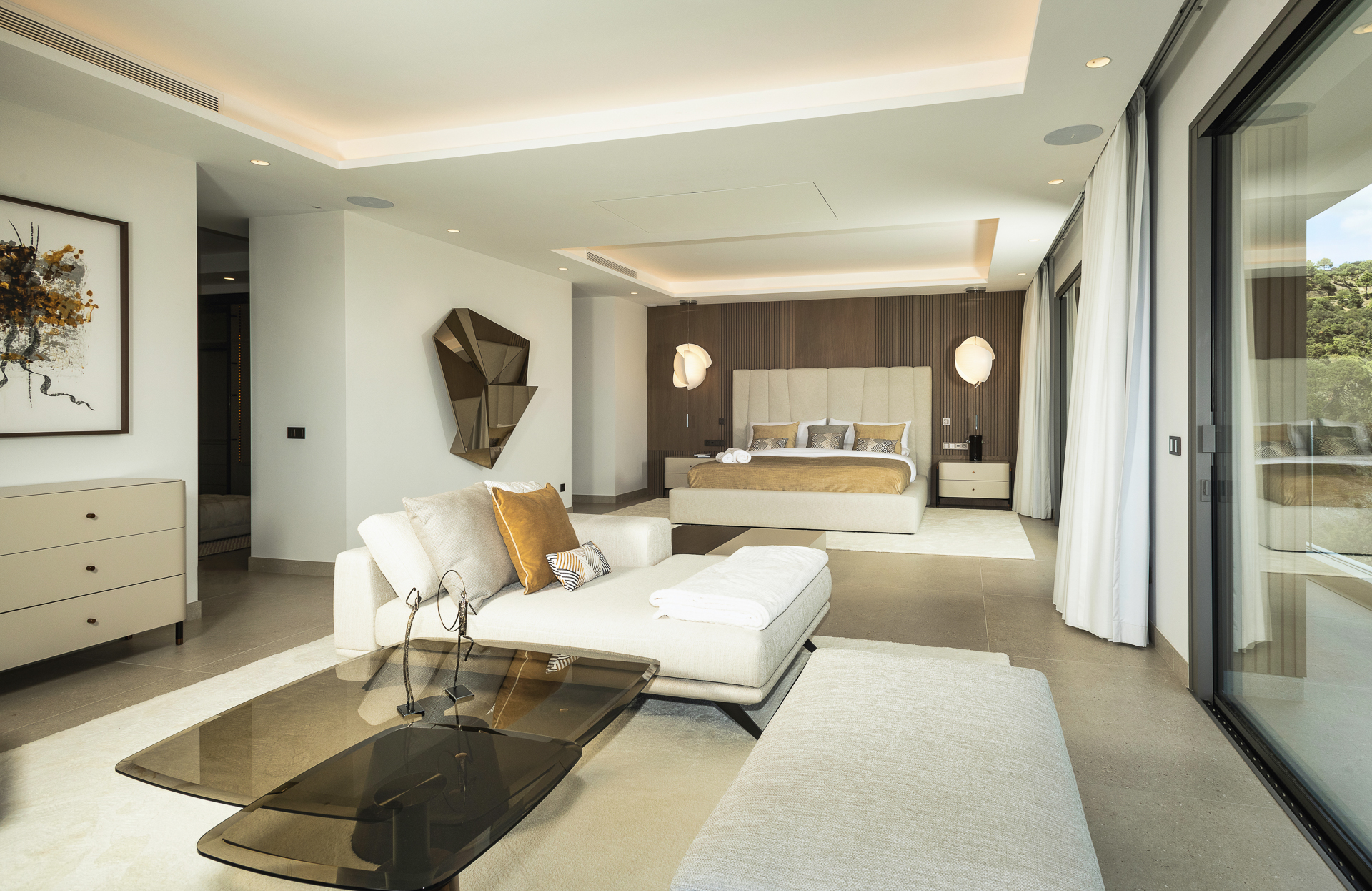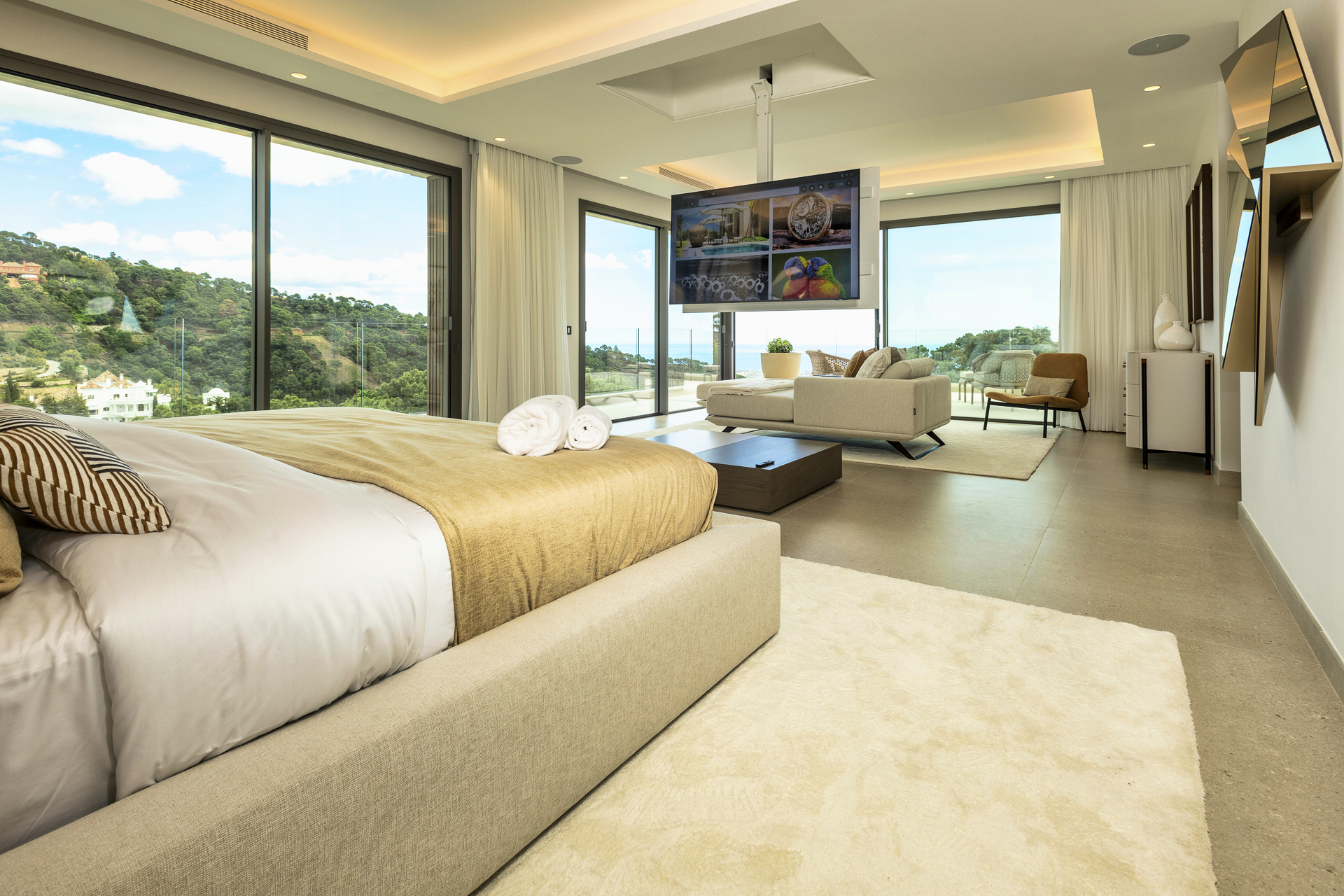 En la planta superior, la villa se divide en dos alas independientes. La primera aloja dos dormitorios en suite y la suite principal, que dispone de dos baños privados (para él y para ella) y vistas privilegiadas. La segunda ala cuenta con otras dos suites adicionales, cada una con su propia terraza privada. Todas las habitaciones están orientadas para ofrecer vistas despejadas a las montañas y al entorno natural.