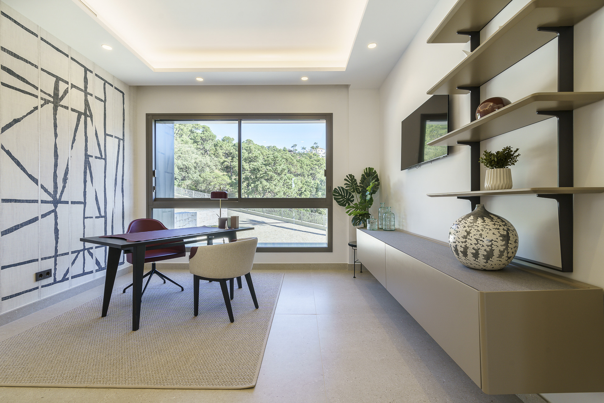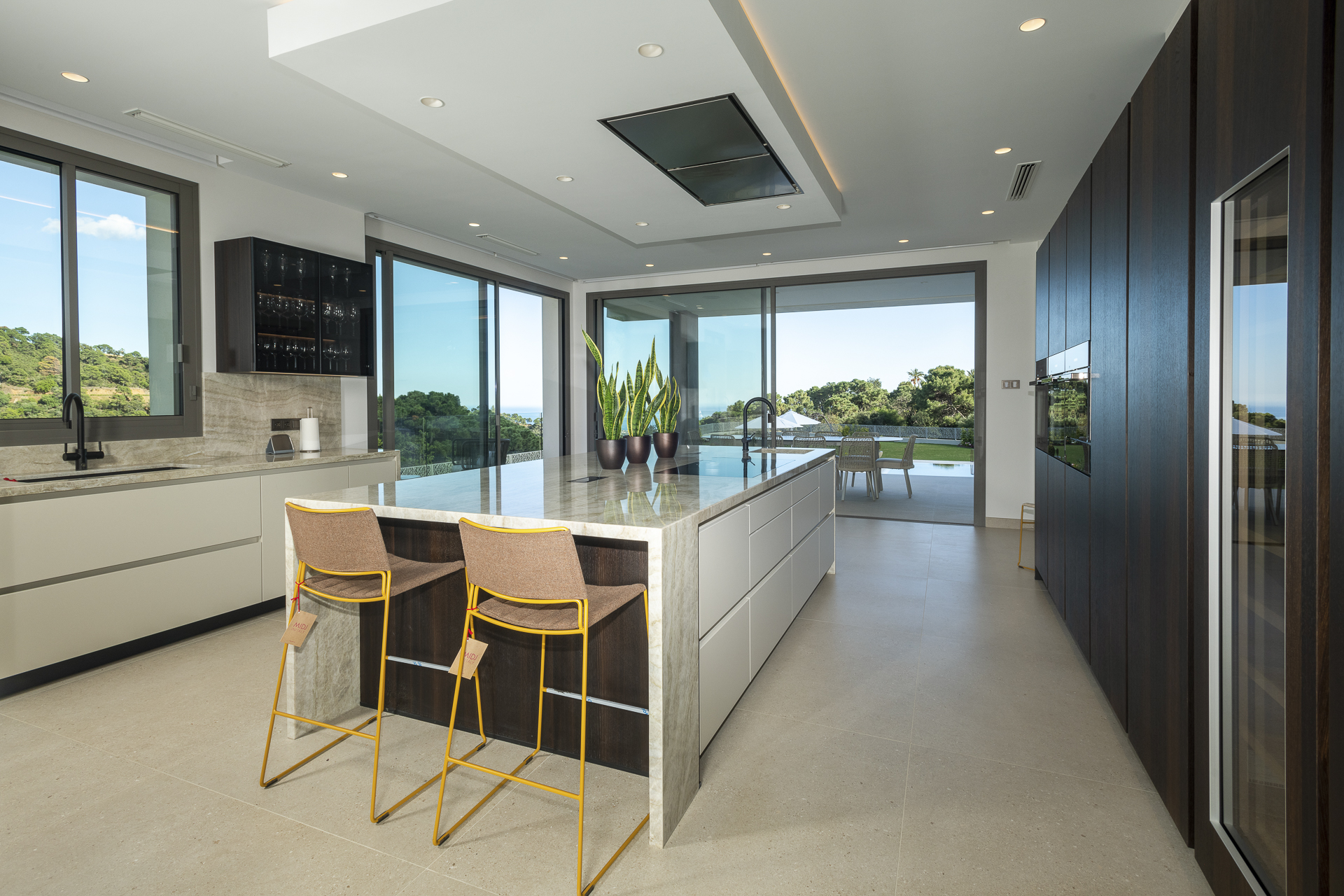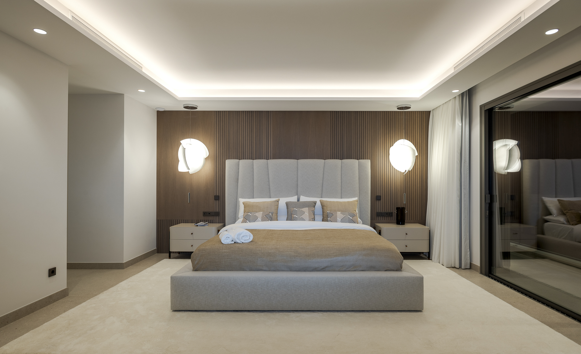 En la planta superior, la villa se divide en dos alas independientes. La primera aloja dos dormitorios en suite y la suite principal, que dispone de dos baños privados (para él y para ella) y vistas privilegiadas. La segunda ala cuenta con otras dos suites adicionales, cada una con su propia terraza privada. Todas las habitaciones están orientadas para ofrecer vistas despejadas a las montañas y al entorno natural.