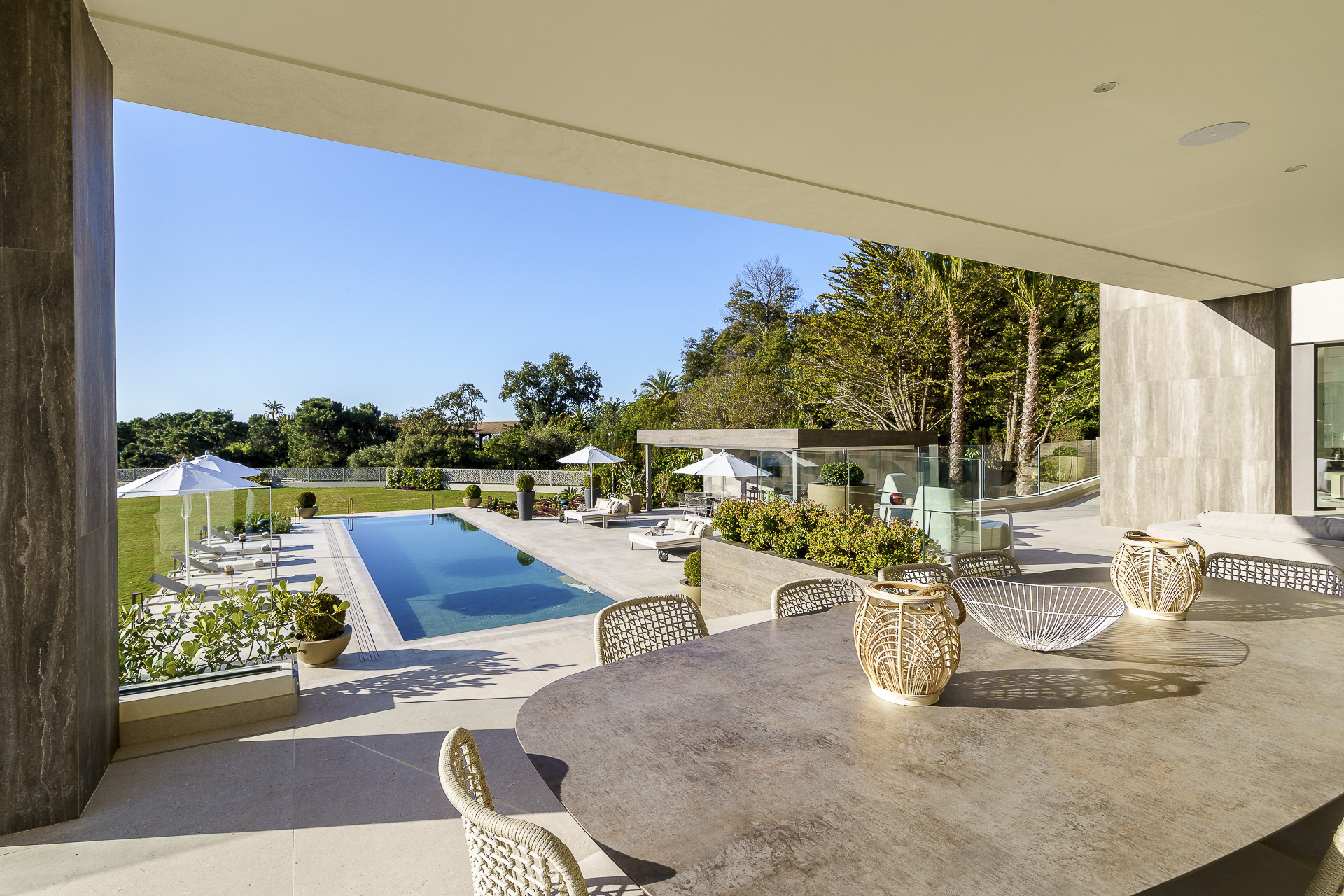 El exterior de la propiedad ha sido diseñado para disfrutar del clima mediterráneo durante todo el año. Cuenta con un jardín paisajístico, una piscina exterior espectacular, amplias terrazas, zona de barbacoa y una cocina al aire libre. El espacio de aparcamiento incluye capacidad para 10 vehículos exteriores y un garaje privado para 4 coches adicionales.