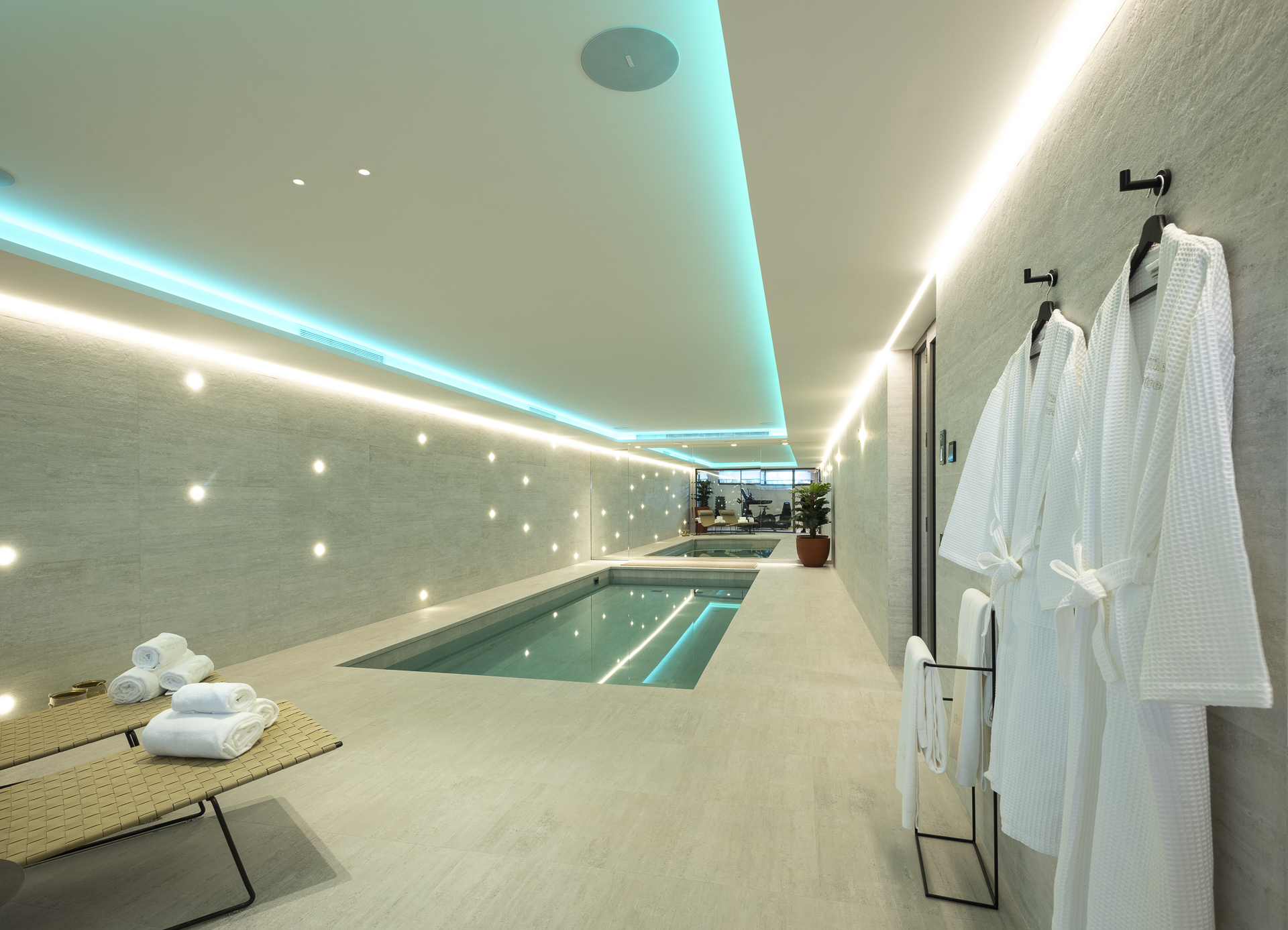 La planta inferior está diseñada como un auténtico refugio de bienestar y ocio, con un completo spa interior, piscina climatizada, sauna, baño turco, gimnasio, sala de juegos con mesa de billar, bodega climatizada, bar y zona de estar. También incluye un apartamento independiente para invitados con cocina y baño privado.