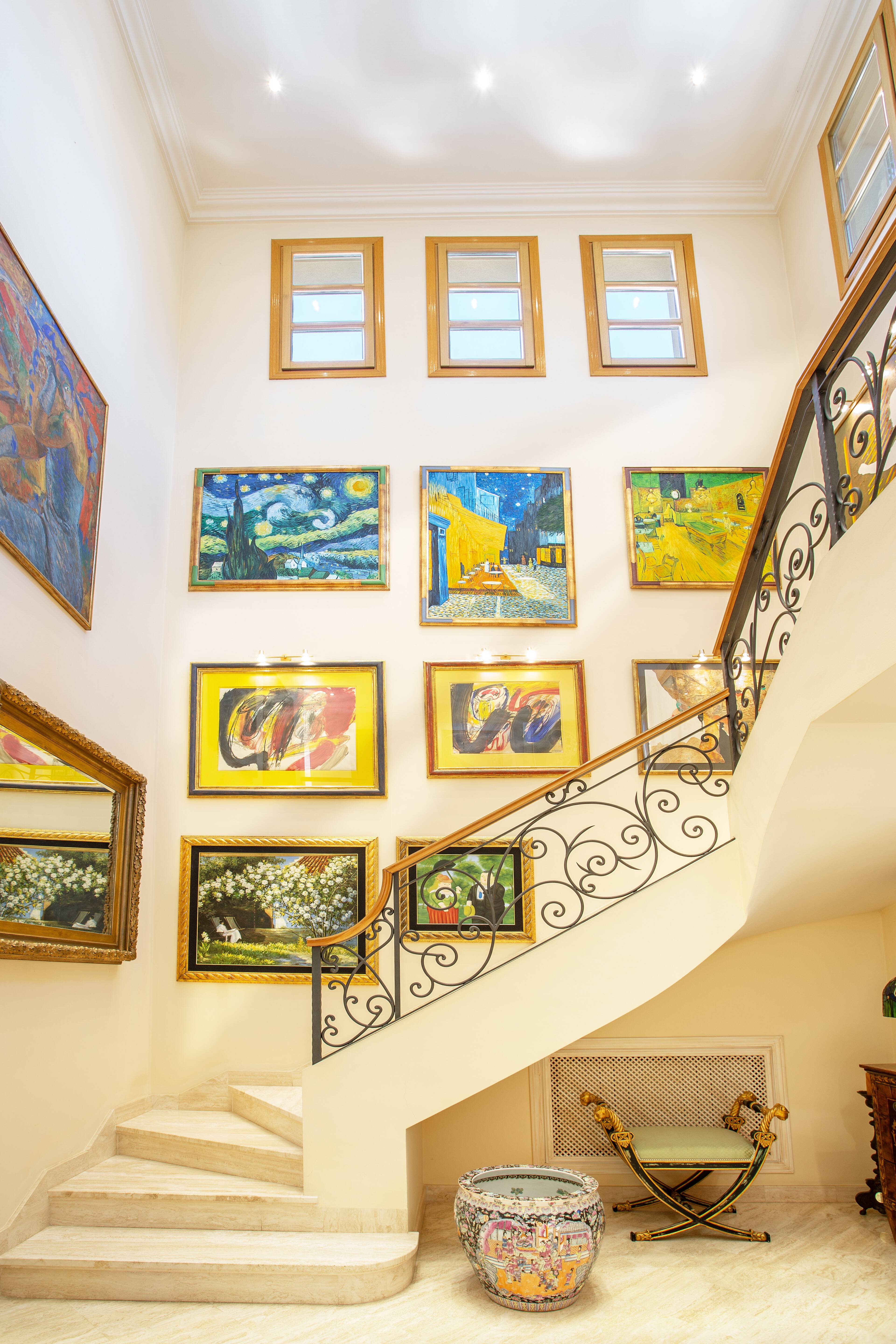 Desde su impresionante vestíbulo de entrada, con suelos de mármol y una escalera central artesanal, la villa abre paso a una planta principal de concepto abierto que integra zonas de salón, comedor y estar, todas ellas organizadas en torno a una acogedora chimenea y conectadas visualmente con el jardín y la piscina gracias a sus ventanales de suelo a techo.